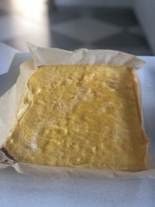 Añadir la masa a la fuente -es muy líquida- y meter al horno por 30 minutos. Meter un palito y si sale seco está listo.