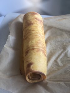 Rápidamente agregar un poco de azúcar encima y con el mismo papel ayudarse para ir enrollando la bizcocho. Terminar con un poco más de azúcar.