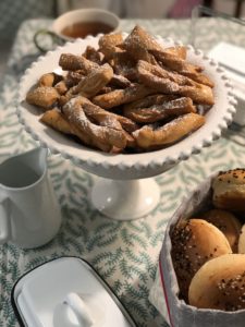 Usleree la mesa sobre una superficie enharina hasta dejarla de 3cm de grosor. Corte un rectángulo, sacando la masa sobrante, corte rombos de 10×5 cm, y haga sobre ellos un corte vertical en el centro de unos 3 cm de largo y pase por él uno de los extremos.