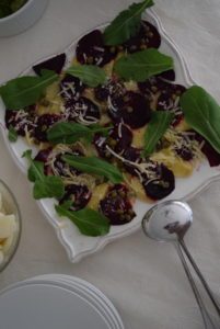 En una fuente poner intercaladamente las alcachofas y las betarragas, luego agregar la rúcula, aceite de oliva, jugo de limón, zestes de limón, alcaparras, sal y slice de parmesano.
