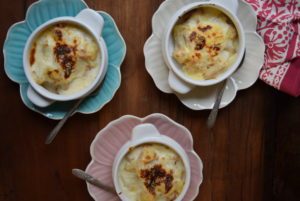 La mezcla anterior se agrega a los moldes individuales. Espolvorear queso rallado y hornear hasta que esté dorado el chupe. Servir de inmediato.