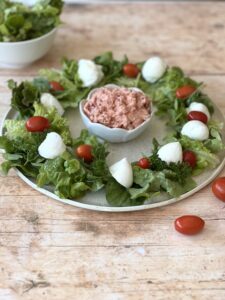 En un plato redondo poner la lechuga en forma de corona, decorar con tomates y bocconcinis, agregar un el aceite.