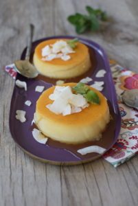 Para desmoldar ponerlos en una fuente con agua caliente y pasarles un cuchillo con cuidado. Servir con el coco arriba y una hoja de menta.