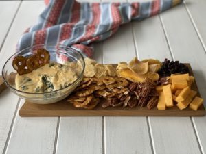 En una tabla poner un un bol el dip de queso caliente o tibio, alrededor los pretzel crispy, mango, nueces pecanas, cramberrys, queso picado red cheedar y galletas de queso.