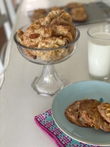 En un bol añadir la mantequilla y el azúcar hasta que esté la mezcla cremosa. Agrega el huevo, vainilla, batiendo todo, terminar agregando la harina y de manera envolvente los cereales y las pasas.