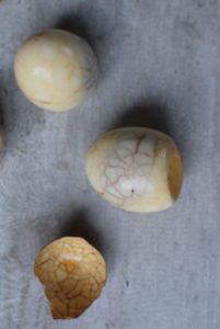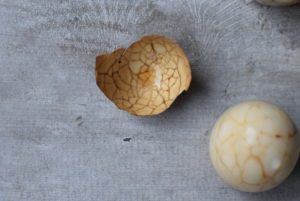 En una olla con agua caliente agregar la soya, té negro, betarraga, salsa inglesa, orégano y tomillo. Agregamos los huevos y volvemos a hervir, luego bajamos al mínimo para que se cocinen por 1 hora más. Se les deja reposar una noche completa en el líquido de cocción.