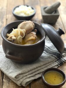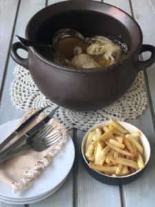 Este pollo me lleva a los sabores de mi niñez, cuando mis papás me llevan al pueblo de Lo Barnechea a una casa donde lo que sea comía era este pollo humeante en una olla de greda con una bandeja llena de papas fritas, una gran mezcla.