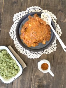 Acompañamiento: Servir con un arroz verde de espinaca. Cocinar el arroz como siempre, pero agregarle una taza de espinaca molida junto con el agua -metes las hojas en la minipimer y le poner un poco de agua, salpimentar y cocinar-.