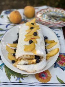 Montar la crema y esparcirla encima del merengón, continuar con los duraznos en láminas delgadas y los arándanos.