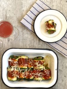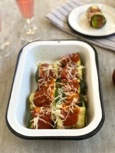 Relleno: En la minipimer añadir la taza de garbanzos, tomates hidratados, orégano, queso crema, ralladura de medio limón unas dos cucharadas del líquido de los tomates, debe quedar una pasta bien compacta. Luego agregar las nueces picadas y la media taza de queso rallado. Tomar un zapallo y poner un poco de la mezcla de los garbanzos al inicio del zapallo para que puedas ir enrollándolo, atraviesa cada uno con un palito.