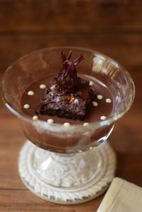Emplatado: En una fuente individual añadir un cucharón de sopa de chocolate, un pedazo de brownie y por último los chocolates de caviar blanco.