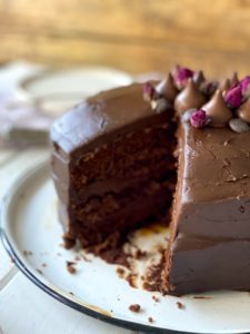 El devil’s food cake, o Torta del diablo, es un pastel tradicional de origen estadounidense con mucho chocolate, preparado con varias capas de bizcocho de cacao suave, y relleno con ganache de mas chocolate.