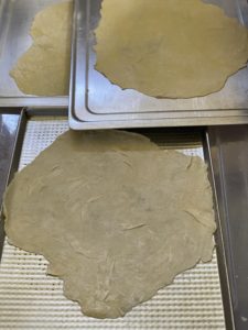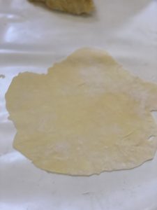 • En un bol unir 500 grs de harina, 8 yemas, 8 cucharadas de aceite, alcohol y 18 cucharadas de leche. Amasar hasta que se una la masa el menor tiempo posible. Dividir la masa en 16 bollos de 5 grs cada uno. Usar harina abajo y arriba de la masa antes de usrelear y agregar más si se necesita.