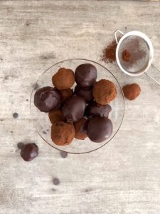 - Derretir el chocolate a baño maría- -en un olla poner agua a calentar, cuando empiece a hervir apagar y poner el bol, que no toque el agua, para que el chocolate se derrita. Sacar del fuego y agregar crema y el licor que elegiste. Agregamos los dátiles, nueces molida y mezclar. Dejar en el refrigerador unos 10 minutos.
