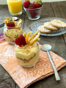 Armado: En un vaso poner la mezcla de galletas y mango, luego la crema de naranja, galletas y volver a repetir. Decorar con un poco de mangos cortados en tiras y naranjas deshidratadas o una frutillas frescas.