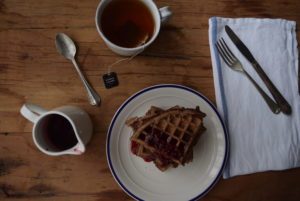 Servir el waffle recién preparado con el syrup de frambuesa.